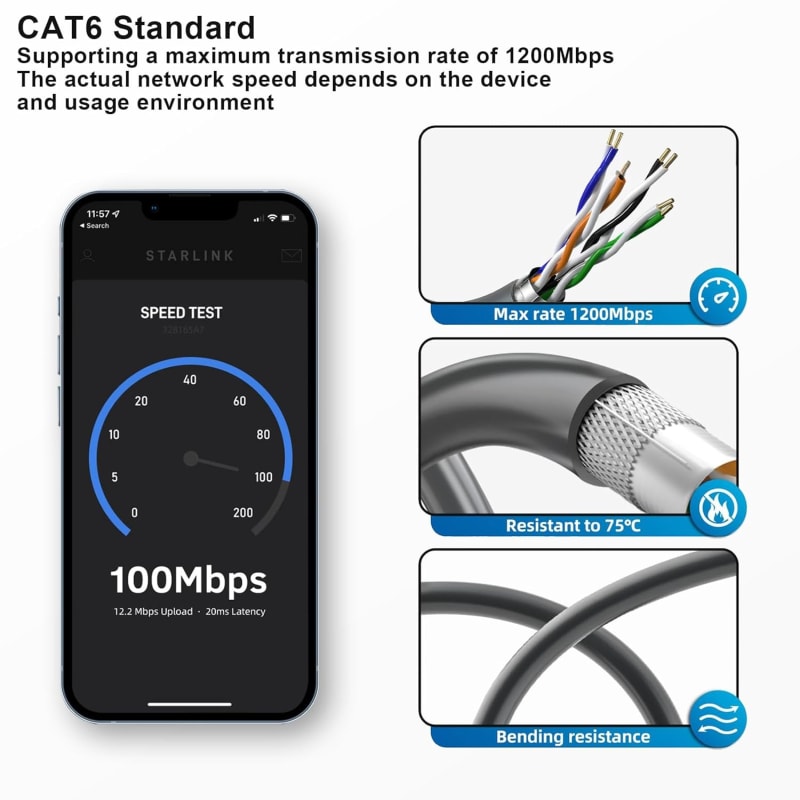 The 45 m (147 ft) Starlink Cable is designed to replace the Standard 15m Cable from the Starlink Kit when additional length is needed between your install location and the router. Compatibility: Standard Starlink Kit Package Dimensions: 89 x 311 x 324 mm (3.5 x 12.3x 12.76 in) Package Weight: 2.9 kg (6.39 lbs)
